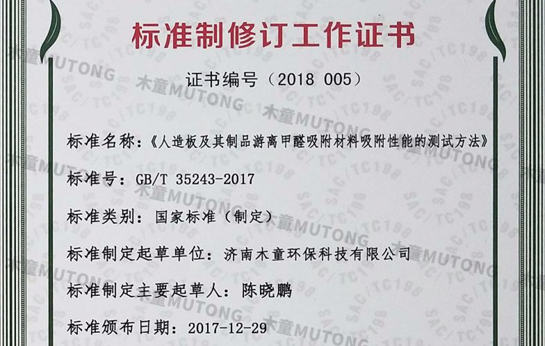 室內空氣污染治理行業是涉及到民生健康福祉的行業,新一屆政府特別重視,上海木材研究所作為國內主要的人造板研究單位,申請了《人造板甲醛吸附材料吸附能力的測試方法》國家標準的起草制定工作,由全國人造板標準化技術委員會(SAC/TC198)歸口。